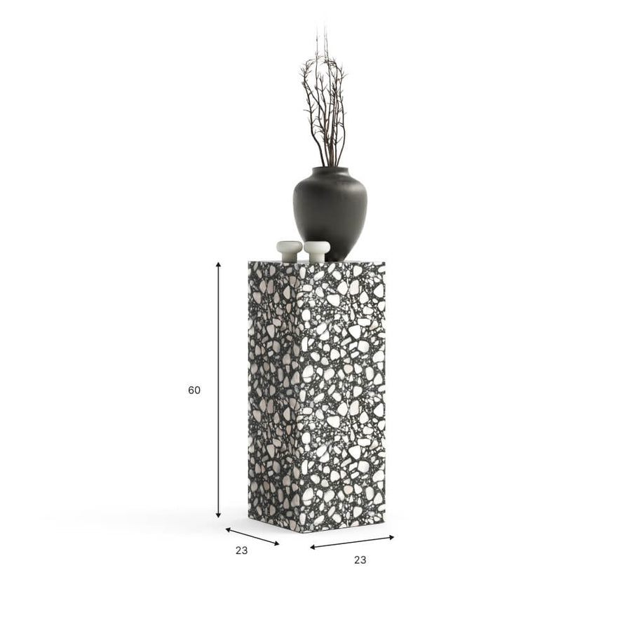 Der Beistelltisch FEO ist ein elegantes Element, das jedes Interieur auf subtile Weise bereichert. Hergestellt aus Palladio Moro Steinkonglomerat, präsentiert er sich als zeitlose Zierde des Raumes und verbindet modernes Design mit der natürlichen Schönheit des Steins. Die schlanke, vertikale Form macht ihn zum idealen Podest für Dekorationen, Blumen oder Alltagsgegenstände. Dank seiner Universalität findet er sich sowohl im Wohnzimmer, Schlafzimmer als auch im Büroraum bestens zurecht und verleiht ihnen Klasse und stilvollen Charakter.